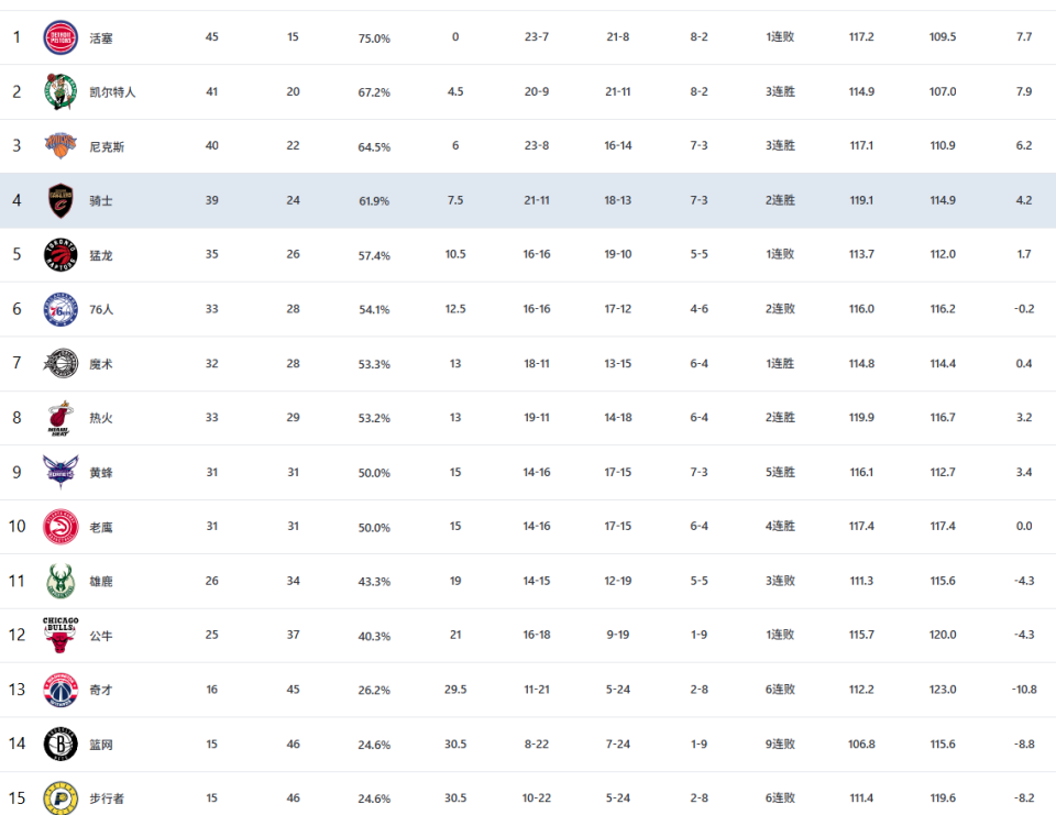 NBA东西部排名进入冲刺阶段!哈登带伤单核带领骑士掀翻联盟第一活塞,火箭迎4连胜劲敌前三位置不稳。